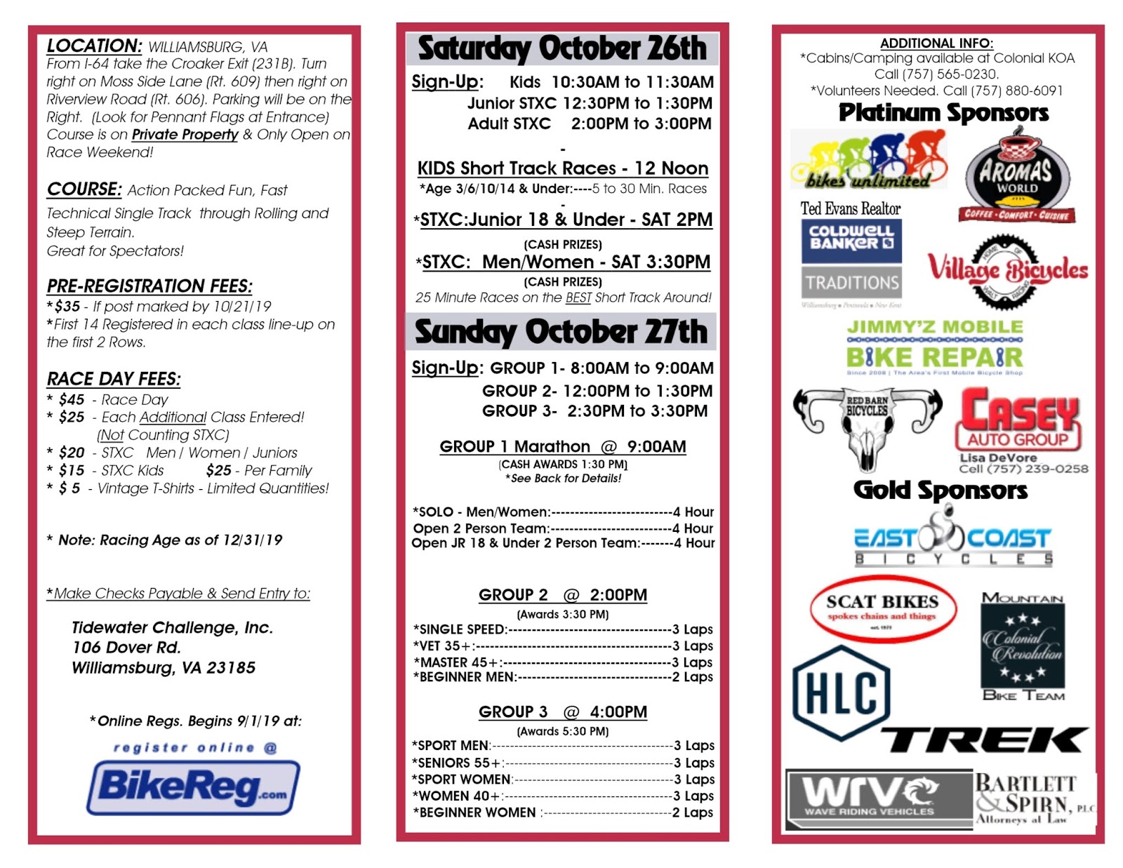 Special Thanks to all our Fantastic Sponsors: York River Mechanical Contracting, Inc., Sports Williamsburg, Bikes Unlimited, BikeBeat, Red Barn Bikes, Village Bikes, East Coast Bicycles, Howard Hanna Realtor-Ted Evans, The Daily Grind at W&M, Conte’s Bike Shop, Scat Bikes, Hawley, Wave Riding Vehicles and Bartlett & Spirn Attorneys at Law.